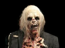 Create an amazing costume with the pro-quality Dark Zombie Halloween mask from The Horror Dome. This impressive mask is an all-latex, over the head design. It’ll provide a seamless look when worn with a shirt or jacket. Grey decayed skin is torn away to reveal a mouth full of still-sharp teeth and a spot of skull. Long spurts of white hair drape down from his dome, and pointy ears and sunken eyes add to the terrifying look. Add a new character to your haunted house attraction, freak out the local kids on Halloween, or get down on the dance floor at that bumping costume party. The Dark Zombie mask is certain to turn heads.