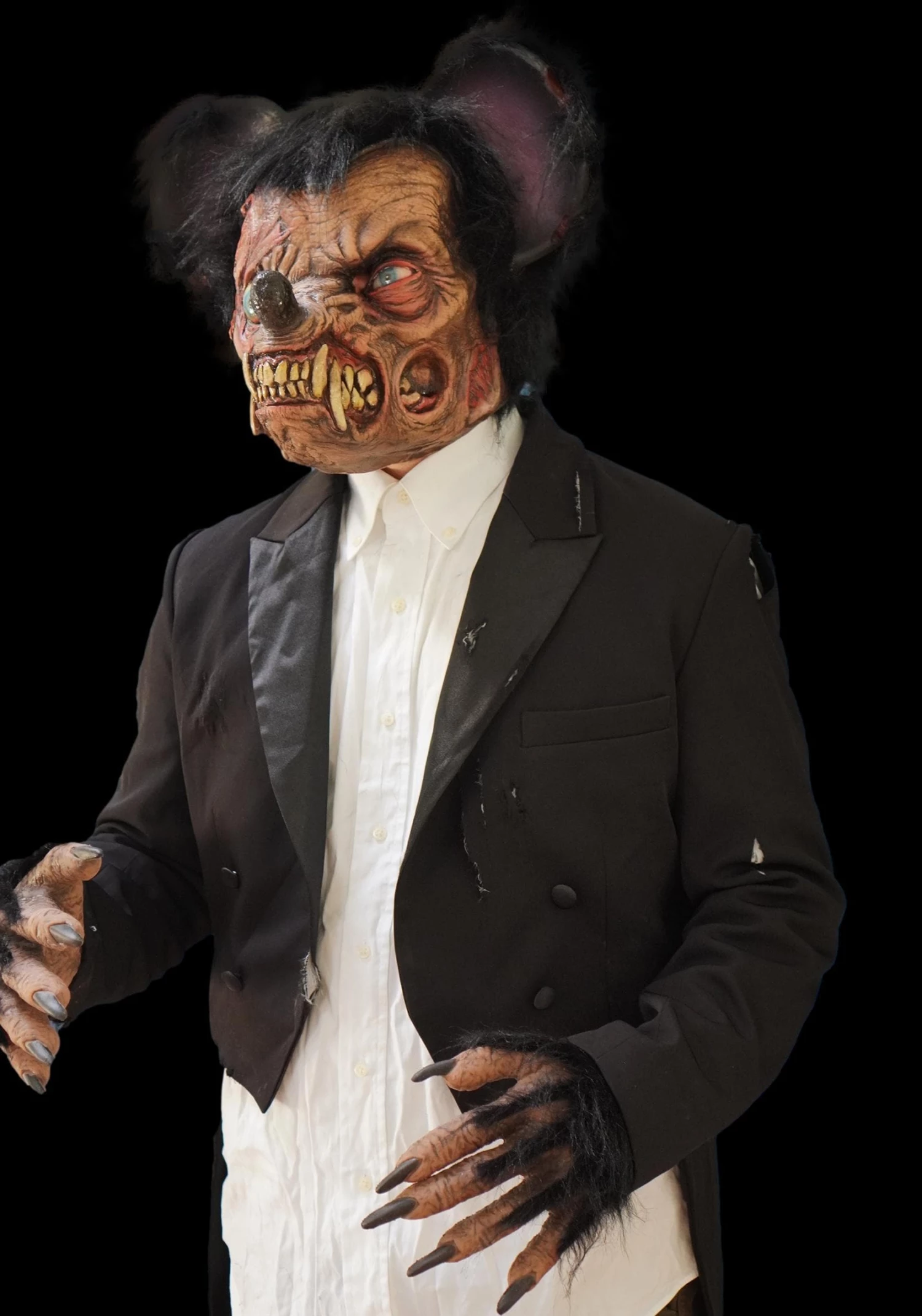 This manged mouse comes with Mangey Mouse mask, high-end movie-distressed tuxedo jacket, and latex hands.