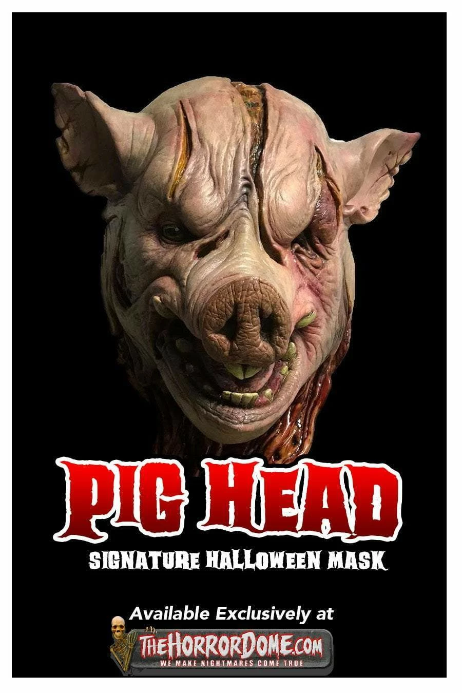 A full, over the head design, the Pig Head Pig Mask will provide a seamless look when worn with a shirt or jacket. Hand crafted by the talented and demented craftspeople at The Horror Dome, this hair raising mask makes an unforgettable and adaptable character that can fit a range of narratives in your haunted house. This is a life size Pig Head Mask that can be used as a mask or prop. Aprox. 17 inches long.