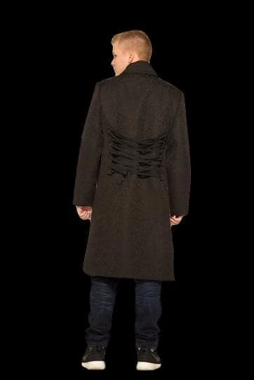 Our stunning jacket is made from a luxurious brocade fabric. Military style metal button detail on the front. The back of the coat has a criss-cross lace up style.
